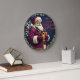 This unique clock features a smiling Santa Claus wearing an unconventional, rich magenta/purple suit with white fur trim, holding a golden wrapped gift tied with a red ribbon. The dark blue background is adorned with stars and eucalyptus-like leaves and bell accents. The text "Santa's North Star Workshop" is written in red script. The design may look real due to the high detail and three-dimensional texture in the artwork.