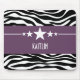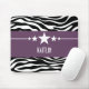 Trendy and modern Sassy Star Zebra Mousepad featuring a chic black and white zebra print background and a bold purple border adorned with a fun star motif. This girly design may be customized with the personalized text of your choosing. Click "Customize It" to find more personalization options.