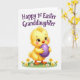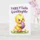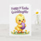This design shows a cute, human-like baby chick in sunny yellow standing on a bright green patch dotted with a few simple spring flowers 🌷. Soft shading and fine feather lines make its down look plush, and its big brown eyes with long lashes give it a tender, affectionate gaze. A gentle pink blush on its cheeks adds to the sweet, friendly mood, like it’s shyly showing something special to someone it trusts. Held close to its chest is a smooth purple egg with a subtle shine, positioned as the main focal point. The background stays plain white so the character and egg stand out clearly. Near the top, the message “Happy 1st Easter Granddaughter” is placed in flowing purple lettering, centered above the chick 🐰. The flowers are small and stylized, scattered lightly around its feet on the green ground.
