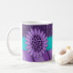 Modern coffee mug with a purple flower, turquoise eyelet ribbon on a purple polka dot and strip background. Customize it by adding text if you wish.