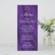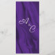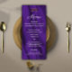 A stylish and elegant purple wedding menu for the wedding reception, featuring a lush, luxe purple pattern of silk. There is a small pair of golden wedding rings at the top on the front of the menu, and all details can be personalized to suit. On the back of the card is the same silky purple design with a custom pair of bridal monograms that can also be customized to suit.
