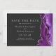 The right-hand edge of this elegant modern save the date card features a purple watercolor agate border trimmed with faux silver glitter. The customizable text combines silver gray serif and copperplate fonts on an off-black background. The reverse side features a matching purple and silver agate design.