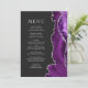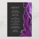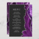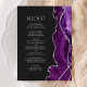 The right-hand edge of this elegant modern wedding menu features a purple watercolor agate border trimmed with faux silver glitter. The customizable text combines silver gray Roman serif and copperplate fonts on an off-black background. The reverse side features a matching purple and silver agate design.