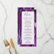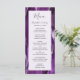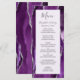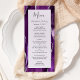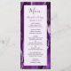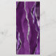 This elegant, modern wedding menu features a watercolor purple agate background trimmed with silver faux glitter. The text appears in elegant charcoal gray handwriting and copperplate fonts on a pale lavender rectangle. The agate design is repeated on the reverse.