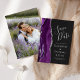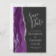The left-hand edge of this elegant modern wedding save the date card features a purple watercolor agate border trimmed with silver faux glitter. The customizable text combines silver gray handwriting, copperplate and italic fonts on a slate black background. Easily replace the sample image on the back with your own vertical photo.