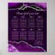 Guide your guests in style with this elegant wedding seating chart featuring a purple agate marble design accented with luxurious silver details. The bold geode-inspired background creates a dramatic and sophisticated look, perfect for fall and winter weddings, formal celebrations, or glamorous evening events. Designed for up to eight tables, the layout keeps names organized and easy to read while complementing the organic agate texture. Ideal for couples seeking a stylish and unique wedding display, this seating chart blends natural stone aesthetics with a refined, modern layout. Easily personalize all text to match your wedding details and create a beautiful focal point for your reception.