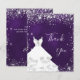 A feminine and elegant birthday thank you card. A purple, uneven colored background color. With faux silver glitter, sparkles and a white drerss. On front a large hand lettered script and the text: Thank You.