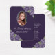 Beautiful purple and silver floral memory card/funeral prayer card featuring a photo adorned with purple roses and baby's breath