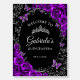 Purple silver Quinceanera welcome foam board sign. Features, script font, glitter silver butterflies, watercolor roses and tiara. Perfect for an elegant princess style glam celebration. Personalize with your own details. Printed Zazzle invitations or instant download digital printable template.