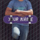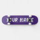 Skateboard deck featuring a vibrant purple design with customizable name space. Perfect for street skating, tricks, or as a fun and personalized gift for skateboard enthusiasts.