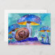 traditional watercolor artwork of surreal blue mushrooms and purple colored snail with a spiral shell on a postcard.