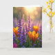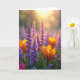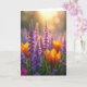This card shows a close-up scene of spring flowers, with tall purple spikes rising beside smooth orange cup-shaped blooms that lean toward each other like close friends ❤️. Warm light pours in from the upper right, giving the orange petals a glowing edge and revealing fine lines running through them. The purple florets are sharply detailed in the foreground, stacked in tiny rows that add a gentle texture next to the softer orange shapes. Behind them, the field fades into a hazy blur of golden circles, like distant lights scattered through the background. The colors balance cool purples against warm oranges, creating a quiet tug-of-war that feels affectionate rather than loud. Near the top, a short Mother’s Day message sits in small, simple lettering in a soft purple tone, with a second line centered below it in warm orange. 🌼 The background remains softly blurred with round, honey-colored highlights drifting across the upper left and center.