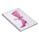 Stiletto fashion - watercolor style image of a modern pink purple knee high stiletto heel boot embellished with 3 buttons, set on assorted pale purple and mauve polka dots. Use the template to personalize with your name or message in eggplant purple script font.