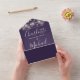 All in one wedding invitation with pretty string lights, signature style names and chic typography on a purple background. The invitation includes a perforated RSVP card featuring a QR code. Designed by Thisisnotme©