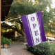 Purple stripe open sign flag with old west antique vertical lettering and pin stripe.