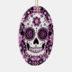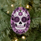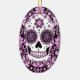 Dia de los Muertos sugar skull in colorful hues of purple surrounded by flowers.