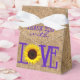Add a modern chic wedding shower favor to your special day. This pretty little favor box is in a popular rustic country burlap background IMAGE with the word "LOVE" using a yellow sunflower and purple text. Text on back "Thank you for sharing my day!" with the brides name and a purple heart. A white ribbon makes this elegant bridal shower guest favor perfect for a barn wedding. This little box is the right size for a gift card. Perfect for your bridesmaids gifts. Personalize with the bridesmaids name on back of box. Don't forget to add one for your mother and mother-in-law to be. Congratulations!