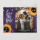 Rustic floral save the date photo postcards featuring sunflowers and string lights on a barn wood background. Ideal card design for a purple rustic wedding party inspired by sunflowers.