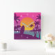 Purple sunset beach art with palm trees.