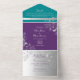 Modern and glamorous, this purple and teal wedding all-in-one invitation features elegant silver floral foil accents, stylish typography, and a built-in RSVP card. The bold jewel tone palette makes it ideal for fall, winter, or evening weddings. The front showcases your names and event details, while the silver floral back includes a reply section and meal preferences. Personalize with your wedding website, location, and date. Perfect for couples seeking a luxurious yet functional format.
