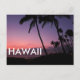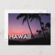 Postcard of a pink and purple sky during a sunset at a beach with black silhouette palm trees on the tropical island of Maui, Hawaii, with the text: 'Hawaii'.