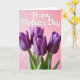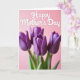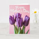 This design shows four deep purple tulips gathered close together near the bottom of the card, their velvety petals slightly curled as if leaning in toward one another like close friends ❤️. Fine vein lines run through the petals, and the green stems rise gently from below, adding a fresh contrast against the soft pastel pink background. The lighting looks diffused and tender, giving the flowers a calm glow and a quietly romantic feel, like a shared moment in a peaceful room. Across the upper third, a flowing white cursive message is centered and easy to spot, standing out clearly against the pink. The spacing leaves plenty of open air around the words, letting the flowers feel like they’re offering the greeting upward. The overall palette stays soft and soothing, with the cool purple tones balancing the warm pink backdrop 🌼. Four tulips sit in the lower portion, with the nearest blooms in sharper focus and the rest fading slightly into a gentle blur.