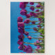 A fun and challenging jigsaw puzzle featuring bright purple tulips against a blue springtime sky