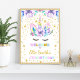 Welcome your guests to a magical day with this purple unicorn birthday sign! Featuring a whimsical design with stars, florals, and pastel tones, it’s perfect for unicorn-themed birthday celebrations. Easily personalize with your child’s name and age.