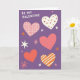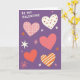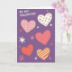 This greeting card features a deep plum purple background that sets a warm, romantic mood. Near the top, the words “BE MY VALENTINE” appear in white, hand-drawn lettering that feels friendly and easy to read. Below the text, five hearts float down the center, each with its own look and color. One heart is blush pink with an uneven white plaid pattern, and another is white with tiny red hearts scattered across it. Farther down, there’s a solid coral heart and a solid orange heart that add a cozy pop of color. The last heart is orange with diagonal cream stripes, and small starburst shapes in white, orange, and pale pink are sprinkled around like confetti. It’s a simple, sweet design that feels full of affection and fun 💕❤️. Hope it helps you share a little love with someone special this Valentine’s Day.