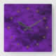 A beautiful clock with a purple velvet background and gold stars for the hours.