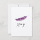 A wedding rsvp featuring a watercolor inspired illustration of a purple feather.