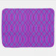 This baby blanket has a Boho design of purple and turquoise waves on a field of light purple.