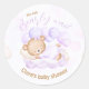 Cute Stickers for girl baby shower. The soft pastel purple / lavender, ivory and beige colors with a cute sleeping baby bear girl on the clouds with the balloons is so adorable for a baby girl's baby shower. Easily personalize the text. Great for a lovely girl baby shower party all year round. :) - Kate Eden Art