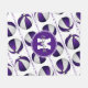 This fun basketball themed fleece blanket features a mirrored pattern of basketballs that have alternating recolored purple and white panels - the phrase "The basketball court is my happy place" in a casual handwritten-style font along with heart shapes in purple stretches between the angled rows of basketballs - athlete name and monogram can be personalized on the large overlying circle pendant - background is customizable white - easily replace the monogram with the player's varsity letter or jersey number - by katz_d_zynes