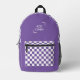 Purple White Checkerboard Check Pattern Logo Printed Backpack features a retro purple and white checkerboard pattern with your custom business logo. Perfect for corporate gifts, school, sports, gym, travel and more. Designed by ©2025 Evco Studio www.zazzle.com/store/evcostudio