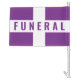 Funeral procession flag in purple with a white cross and FUNERAL written across in clean purple letters.