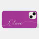 Purple White Elegant Calligraphy Script Custom Personalized Name iPhone 14 Smart Phone Cases features a modern and trendy simple and stylish design with your personalized name in elegant hand written calligraphy script typography on a purple background. Designed by ©Evco Studio www.zazzle.com/store/evcostudio