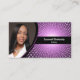 This card design front features a purple and white spiral number background with a photo placeholder on the left and template name and title on the right. The back includes a QR code, coordinated design and colors, and text fields for the business name and details. Replace the placeholder photo with your vertical format photograph and your link for the QR Code. Use the QR code to send potential customers to your website, referrals or another business oriented page. Fill in the template fields or edit using the design tool to select a font style, size, and color you like. The placeholder photo is courtesy pixabay.com.