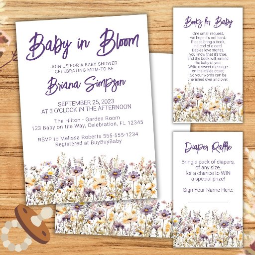 Purple wildflowers gender neutral baby shower. Customize names, dates, and information.