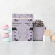 Destei's Halloween illustration of purple and white striped witch legs. The witch is wearing a black skirt and black shoes. The shoes have some purple details on them and there are some spiders hanging around the witch. The background color is light purple and there are two personalizable text areas.