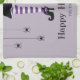 Destei's Halloween illustration of purple and white striped witch legs. The witch is wearing a black skirt and black shoes. The shoes have some purple details on them. There is also a witch's hat next to the witch and three spiders hang on the right. There are also two personalizable text areas. One of the sample texts reads: "Happy Halloween!" while on the other one there is space for a family name or other custom text. The background color is light purple, but it can be changed to any other color, if so wished.