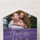 All in one photo wedding invitation with pretty string lights, mason jars, signature style names and chic typography on a rustic purple wood background. The invitation includes a perforated RSVP card that can be individually addressed or left blank for you to handwrite your guest's address details. Designed by Thisisnotme©