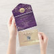 Step into rustic elegance with this all-in-one wedding invitation, featuring a regal purple wood background, glowing string lights, and intricate gold floral lace. A classic monogram adds a personal touch, while the back showcases your custom couple photo. Designed for modern convenience, it includes space for your wedding website and QR code to simplify RSVPs and share extra details. Perfect for fall, winter, or barn weddings, this invitation blends country charm with contemporary style for an unforgettable first impression.