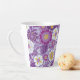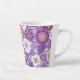 This latte mug features flowers and leaves in shades of purple, magenta, yellow, and white on a purple background.