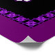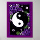 A poster with a yin yang symbol surrounded by green and purple paisley against a black background.