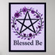 This whimsical poster features a black pentacle surrounded by purple flowers and leaves on a lavender background, with the phrase "Blessed Be" symbolizing spiritual blessing and protection.