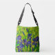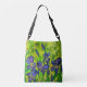 Irises in blues and purples with a multi green back ground. I am an artist and paint in bright bold colors inspired by nature.