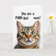 This card features a close-up portrait of a striped tabby cat, with its face filling the lower part of the design as if it’s leaning in for a friendly cuddle ❤️. The fur shows layered brown and black stripes that look soft and touchable, and the cat’s wide golden eyes catch tiny highlights that make the gaze feel tender and attentive. A small pink nose sits above a gentle mouth, while long white whiskers fan outward to frame the expression. The background is plain white, keeping the focus on the cat and the message above it. Centered near the top, the text reads “You are a PURR-fect mom!” with “PURR” in uppercase, set in rounded black lettering. The layout leaves generous open space between the words and the cat’s ears, giving the design a light, affectionate feel 🌼. Fine light reflections sparkle in both eyes, and the whiskers curve slightly toward the edges of the card.