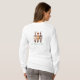 Womens white hoodie with 3 Christmas cats in a row facinf you on the front with "Purry Christmas" in snow-covered lettering, and with them walking away with bow-tied tails held high on the back with "and a Happy Mew Year" in script.