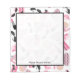 A notepad featuring a design consisting of pink and black retro cat eye sunglasses, pink change purses with gray polka dots, pink clutch purses with black bow, pink lipsticks, pink gemstones, and bottle of perfume with pink atomizer.